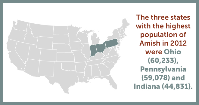 The three states with the highest population of Amish in 2012 were Ohio (60,233), Pennsylvania (59,078) and Indiana (44,831). Population can vary widely as expanding settlements try to acquire additional farmland or try to find isolated areas that are conducive to a seclusionary lifestyle. But no matter where they are, the Amish add value to the community by bringing a simple, quiet lifestyle with a dedicated work ethic and high-quality workmanship.