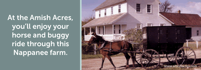 - Amish Acres. As the only Amish farm listed in the National Register of Historic Places, you’ll enjoy your horse and buggy ride through this Nappanee farm. Your PastPort is your ticket to a guided tour, a documentary and a wagon ride complete with stops at the one-room schoolhouse and blacksmith shop. The buggy ride takes you around the pond and through the woods, and you’ll enjoy the relaxing sounds of horses’ hooves on gravel as you go back in time.You’ll find a variety of locally produced products, like baked goods, quilts, meats, cheeses, and fudge. We think it’s one of the best Amish tours you’ll find.