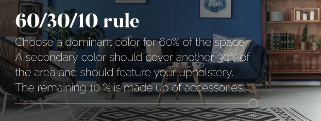 Choose a dominant color for 60 percent of the space — this will typically include the walls. A secondary color should cover another 30 percent of the area and should feature your upholstery. The remaining 10 percent is made up of accessories. The result is the percent balance of color.