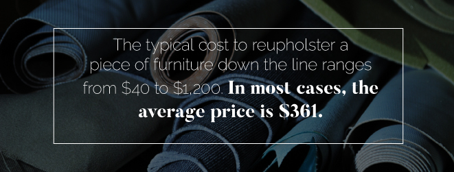 Considering these factors will make you happier with your selection, plus save you time and money. If you choose something that does not last, either due to poor quality or a change in taste, it can be expensive to change the look later. The typical cost to reupholster a piece of furniture down the line ranges from $40 to $1,200. In most cases, the average price is $361, with couches and small chairs ranging between $343 and $961.