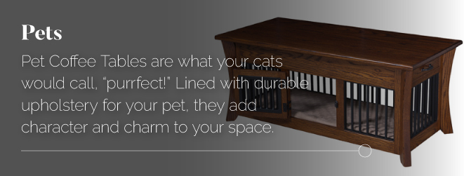 Pet Coffee Tables are what your cats would call, “purrfect!” Lined with durable upholstery for your pet, they add character and charm to your space. Additional options for your pet include ramps, steps and beds. With these pieces in place, your best friends will feel right at home, and they’re less likely to make their home on the human furniture.