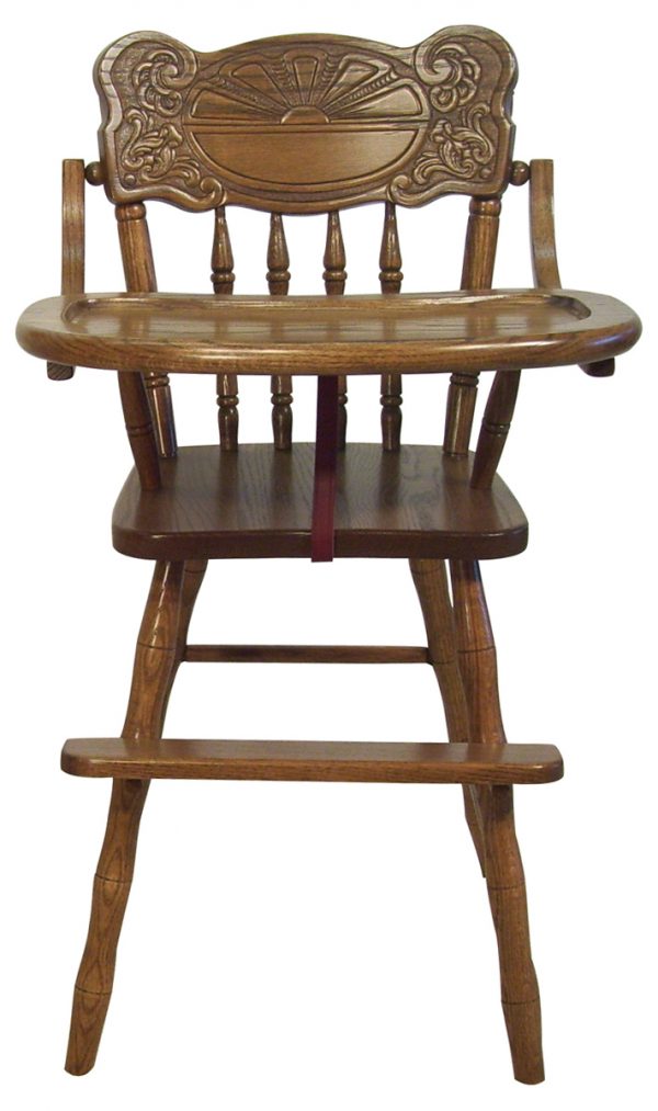 The Amish Sunburst high chair measures 11″D x 36 1/2″H, with a 14 1/2″W seat that sits 20 3/4″H off the ground. We offer it in oak, with several stain choices ranging from natural to dark coffee-colored. Our artisans build each piece by hand, which allows for extensive customization if required. Contact our office directly for more information or to request a quote.