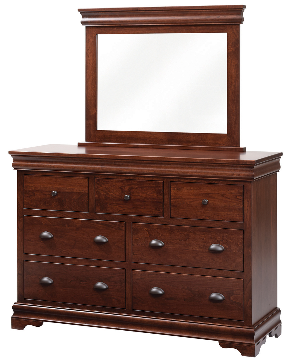 The Amish Luxembourg Dresser with Mirror is part of the Amish Luxembourg Bedroom Collection, featuring beds, armoires and nightstands. You can purchase the dresser as part of the set or buy it individually. Whatever you choose, you get an outstanding piece that will hold up to long-term usage thanks to the exceptional materials and craftsmanship used to make the dresser.