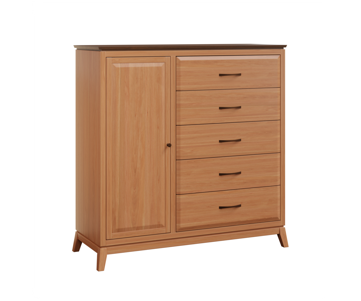 Introducing the Amish Sanford Gentleman’s Chest for your modern bedroom. This American-made gentleman’s chest is constructed with solid hardwoods and is available with premium stains. The gentleman’s chest features dovetailed drawers with full extension soft close undermount drawer slides and measures 56″W x 20¼″D x 54⅞″H. There are two adjustable shelves behind the door along with a clothing rod. Customize the Amish Sanford gentleman’s chest with our selection of stain colors and get a quote to make this piece of craftsmanship part of your home.