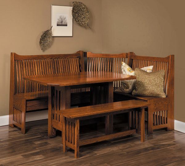 Fantastic style and space-saving practicality are the defining characteristics of the solid wood Amish Mission Breakfast Nook Set. This attractive set is designed to nestle perfectly into your breakfast nook and includes backed benches with 6″ storage areas for extra stowing room. The distinctive Mission design has been a favorite of American homeowners for generations and will provide the ideal complement to your home décor.