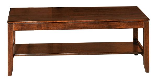 This brown maple wood coffee table offers practical use with its simplistic and sleek design. The flat top has beveled edges for a subtle touch of style. A fixed shelf, offering a place to put decorations or books, attaches seamlessly to the legs.