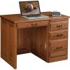 The stylish design of this oak desk includes curved, solid raised panel sides with the knee-hole space measuring 24 1/2 inches in width and 25 inches in height to ensure you are always working in comfort and style. The total width of 65 inches gives the desk’s top surface ample room to spare as you both surf the internet and spread out paperwork. Thanks to the built-in drawers which include a pencil drawer, four storage drawers, and two file drawers; you can keep office supplies right at your fingertips!