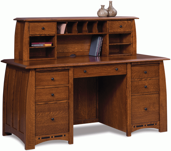 Perfect for a new home, this Amish Boulder Creek desk effortlessly blends traditional looks with modern appeal, giving you the ideal place to get down to work in style! This two-piece construction features pullout trays on each side and a topper with two additional drawers and removable dividers. Try setting this elegant Amish desk at the center of your office space or study, then top it with ceramic pots, an antiqued globe accent, and a small bouquet of fresh flowers for a wonderful display!