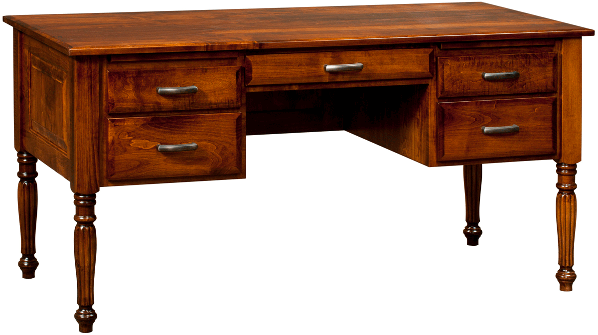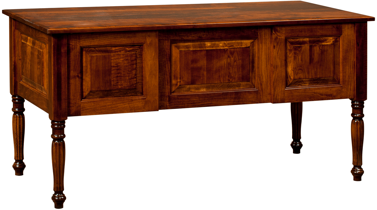 A desk like this is great for anchoring your entryway, living room, bedroom, or study. The 60 inch width is perfect for giving you ample space to tackle your to-do list. There’s also one writing board pull out on each side for writing checks, bills, or filling forms. This clean-lined writing desk has a standard finished back, inset side panels, and is supported by four beautifully carved ornate legs. There is a pencil drawer above the knee space, and two dovetailed drawers on each side to tuck away letters, receipts, office essentials, and more. You can get this piece constructed in oak, brown maple, cherry, or Q.S. white oak and a hand-finished stain of your choice.Â