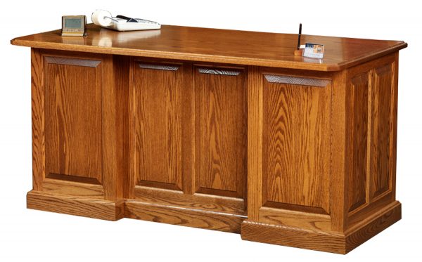 The pedestal base, and raised panel back and sides, provide a unique quality to this desk. The polished finish highlights the natural wood grain creating a sense of serenity in any office space. This beautiful piece measures 60″W x 30″D x 30 3/4″H in size. We also have one available in 72″W (Call for Pricing) if you need more workspace.