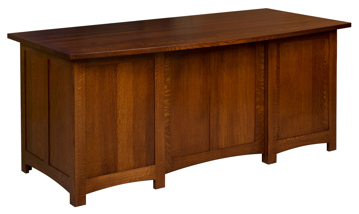 The Amish Oakwood Executive Desk is one of our Amish solid wood desks that comes with a finished back. It’s ready to serve you while you engage in your daily tasks. Inverted panels that go around the entire desk, along with the metal hardware, give its look a unique flair. Wherever you place it in the room, it is ready to greet your clients and visitors, becoming the focal point of your workspace. The desk displayed features beautiful texture and patterns due to irregular markings in the cut Q.S. white oak wood.