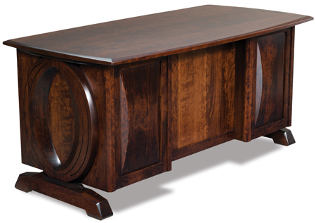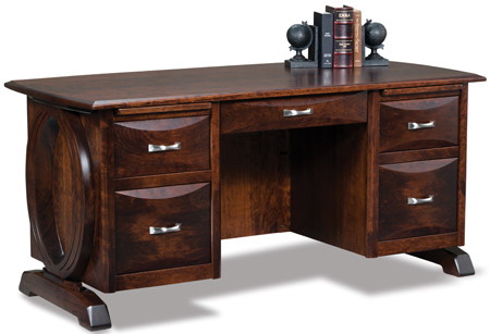The unique and striking features of our Saratoga office furniture are the curved drawer fronts and the signature oval designs on the sides attached to a solid base. Handcrafted expertly by our Amish artisans, the Amish Saratoga Executive Desk design brings out the distinct character of richly grained domestic hardwood. It is given a hand-applied finish and embellished with contemporary metal hardware. In addition, the gorgeous finished back displays curved panels making it a showstopper no matter where you place it in the room.