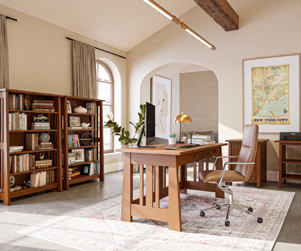 Traditional Mission-styled flared legs and slatted sides are cornerstones of the Amish Freemont Mission design. Select from several hardwood species or a combination of light and dark woods to personalize the look of your home or Office Collections.
